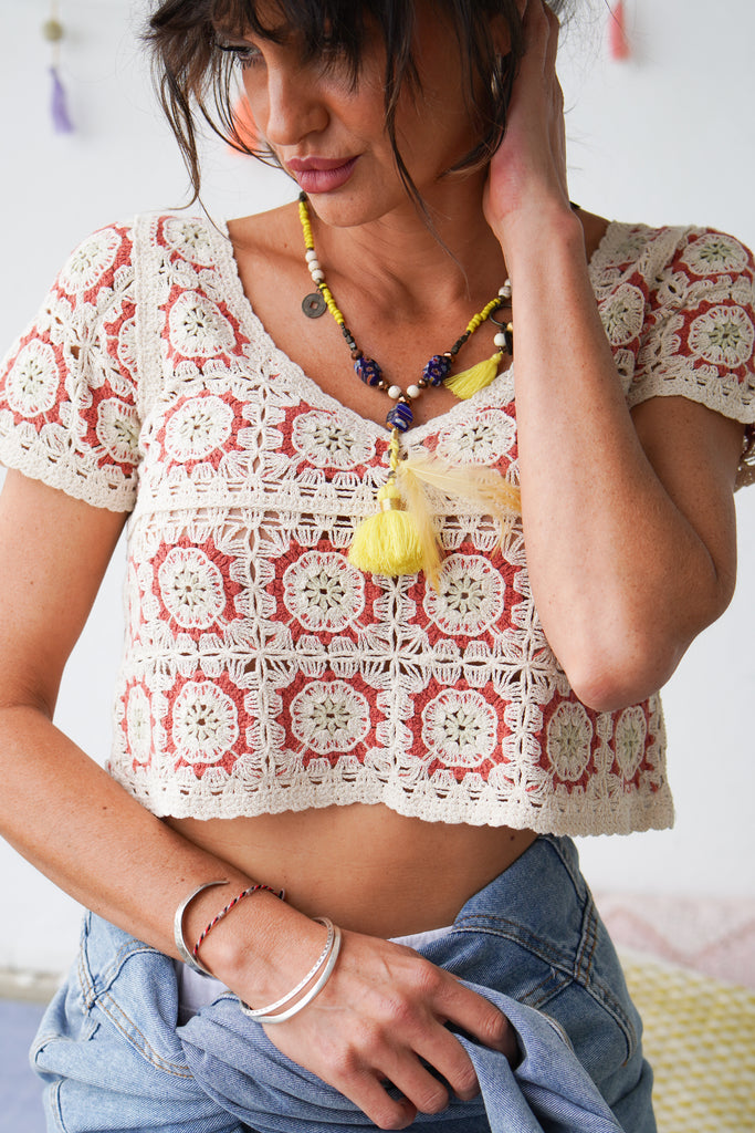 Inject some bohemian vibes into your wardrobe with this adorable Crochet Top. This summertime must-have is perfect for easy style. Cute sleeves and a thick fabrication make this an everyday love of ours.