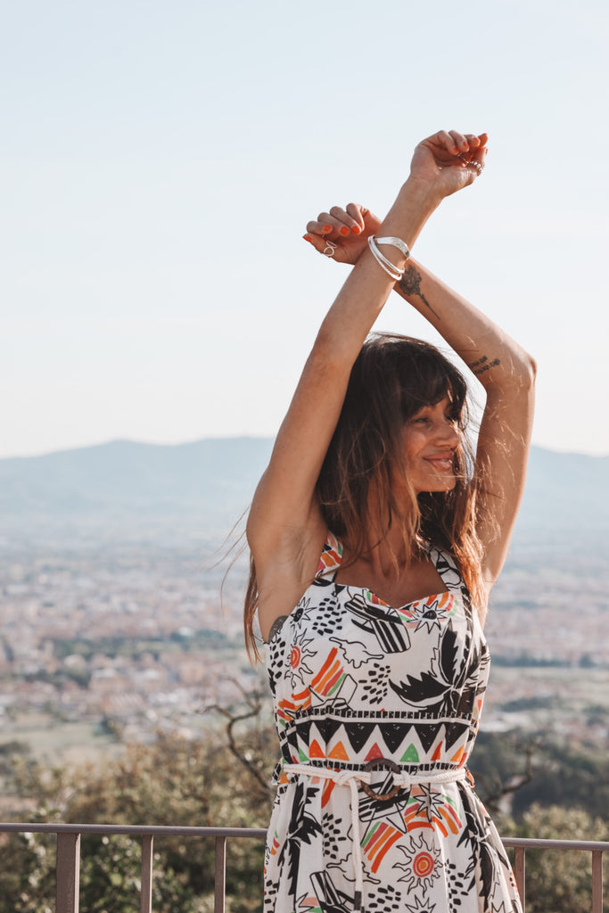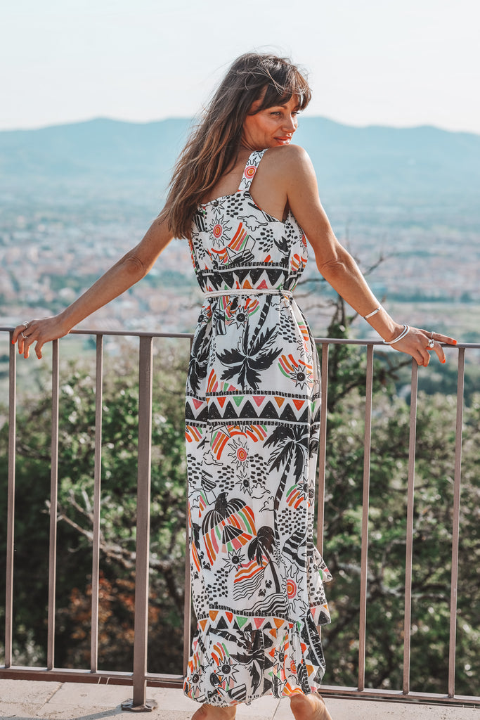 Treat yourself to a bohemian look in our 'Feel The Sun' Maxi Dress! With its soft cotton finish and lovely sunny pattern featuring palm trees and beachy vibes, it'll make you feel like you so special! Handmade in Italy for that something extra. Long and flowing with a frill bottom and cord belt with a coconut ring finish. this show-stopper fits sizes 8-14