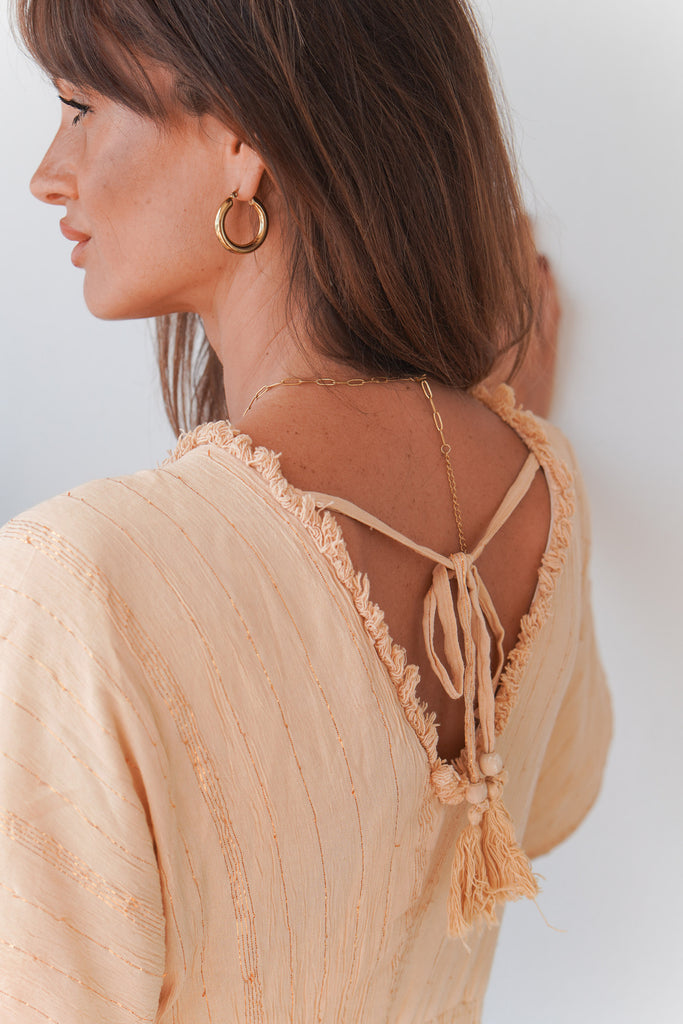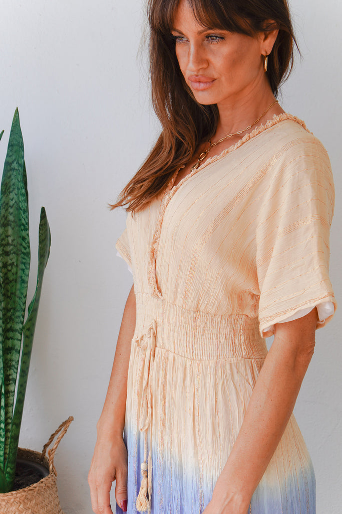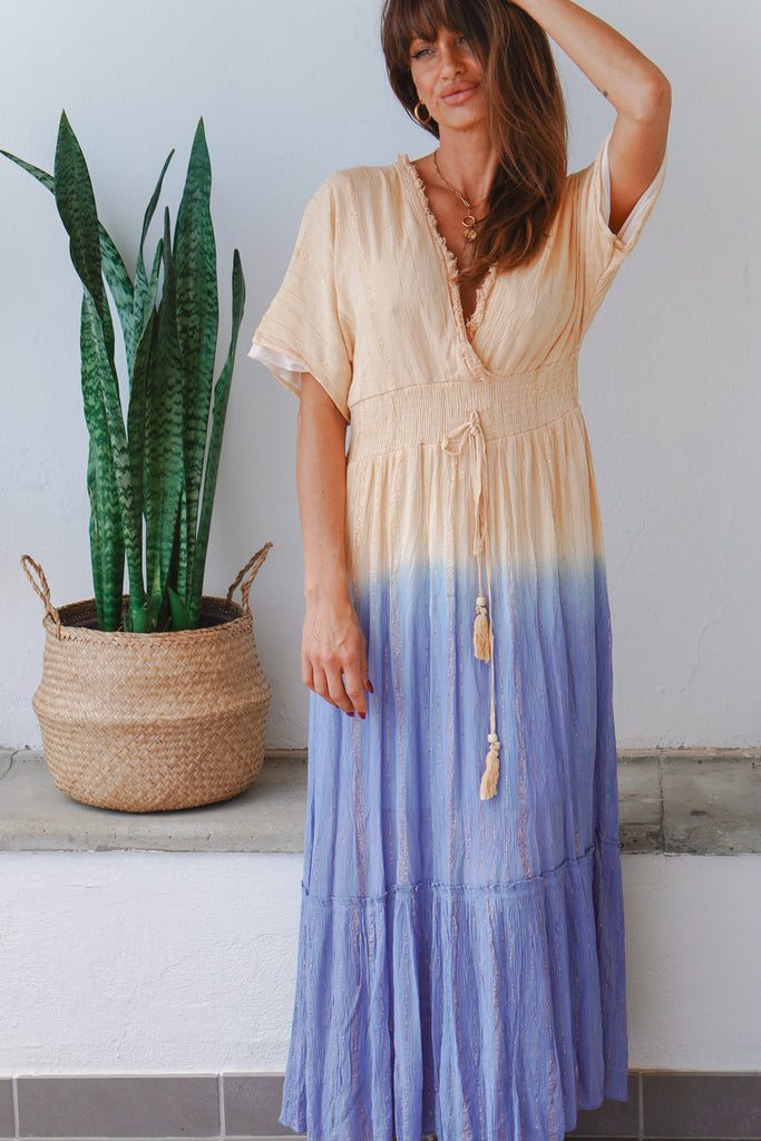 Feel all the boho vibes in our 'Take A Dip' boho maxi dress, featuring a uniquely stunning cream and blue dip dye pattern and tassel detail. Handmade in Italy with soft fabric and delicate detail, this delightful maxi dress looks and feels amazing. Thick enough to wear on the chilly evenings.