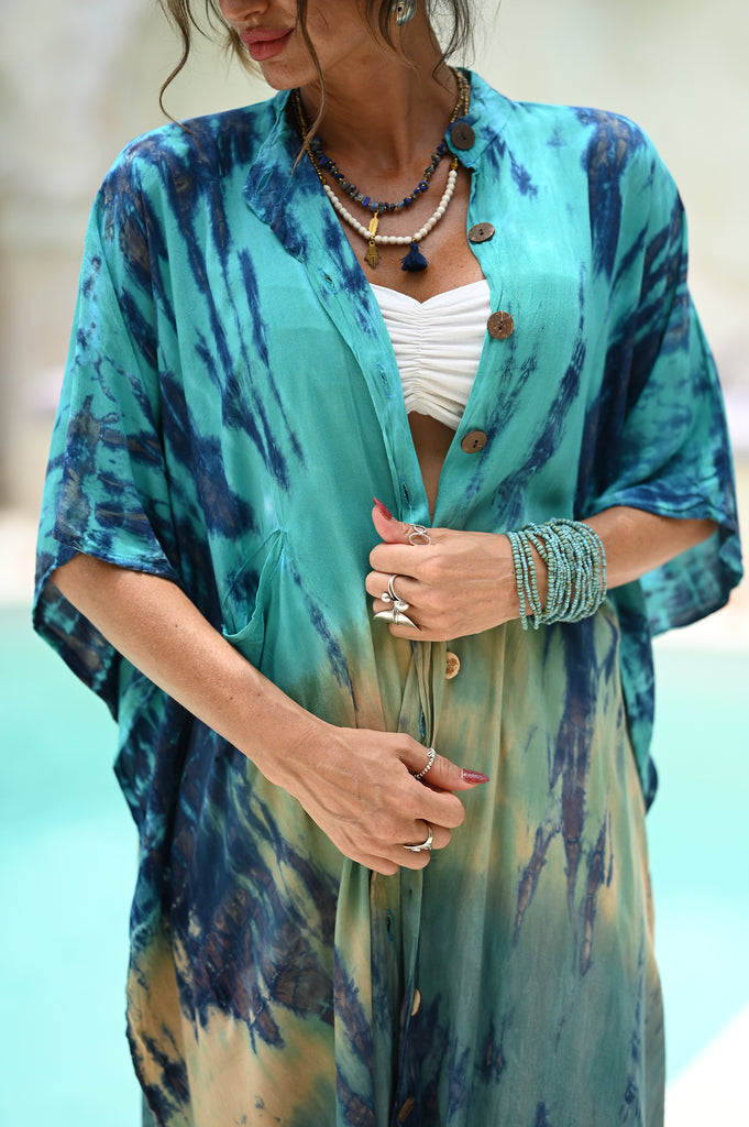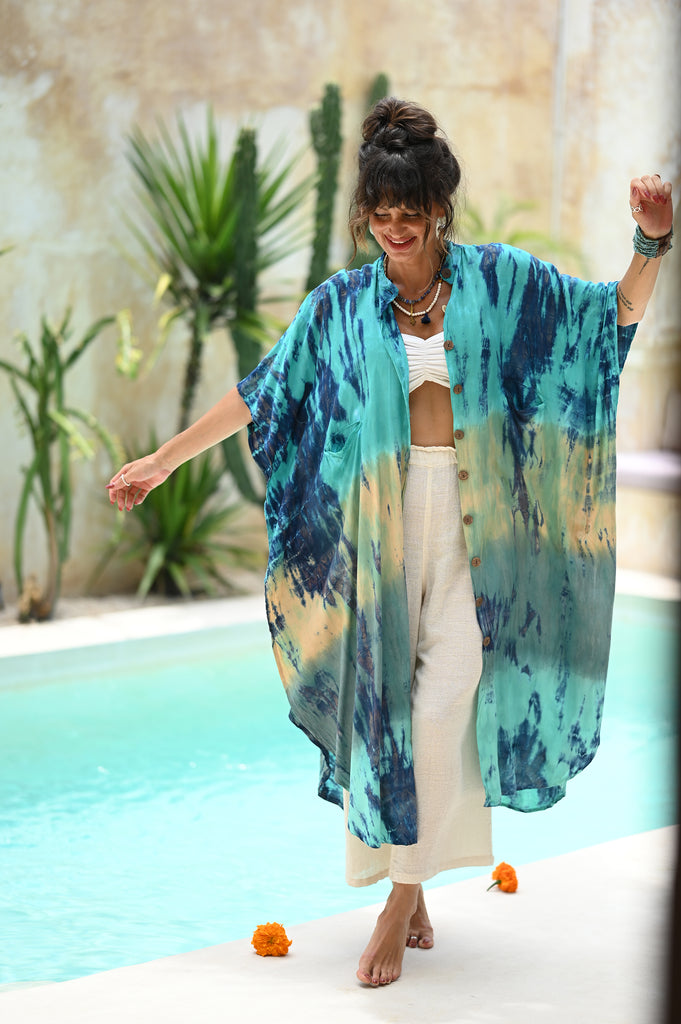 Ultimate boho vibes in this unique tie-dye kimono jacket with buttons at the front, so you can wear it open and closed and is great for layering. Layer over a bikini in the summer, or use as a lightweight jacket in the cooler months or just for at home and being cosy.