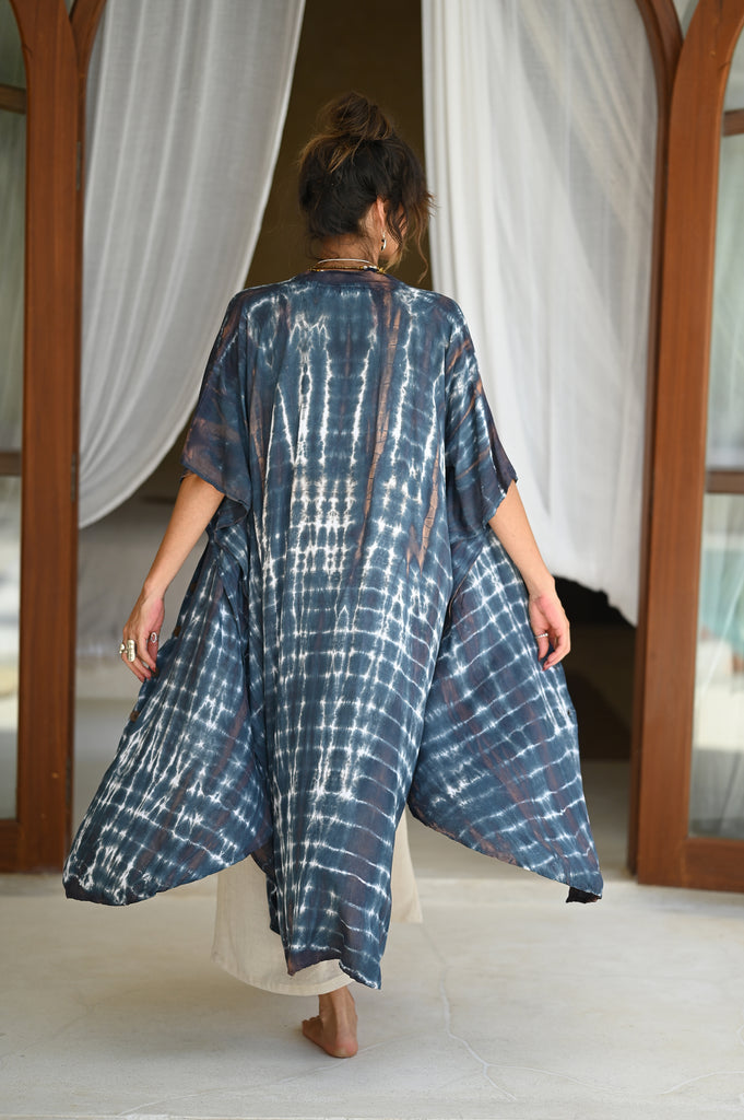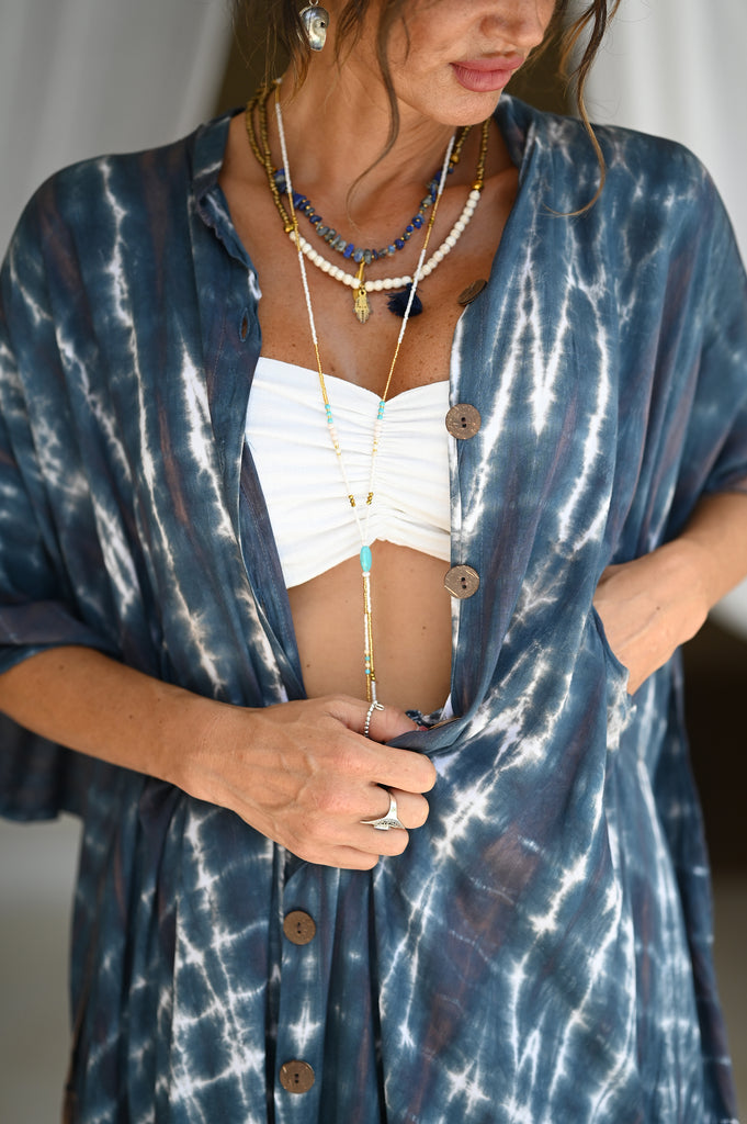 Ultimate boho vibes in this unique tie-dye kimono jacket with buttons at the front, so you can wear it open and closed and is great for layering. Layer over a bikini in the summer, or use as a lightweight jacket in the cooler months or just for at home and being cosy.