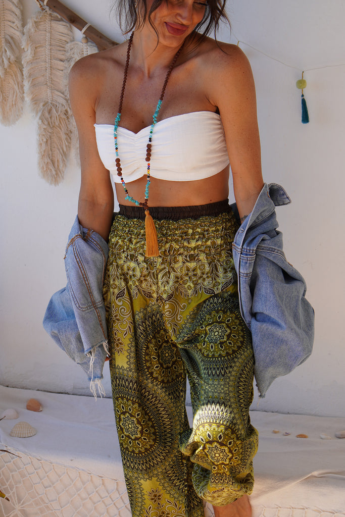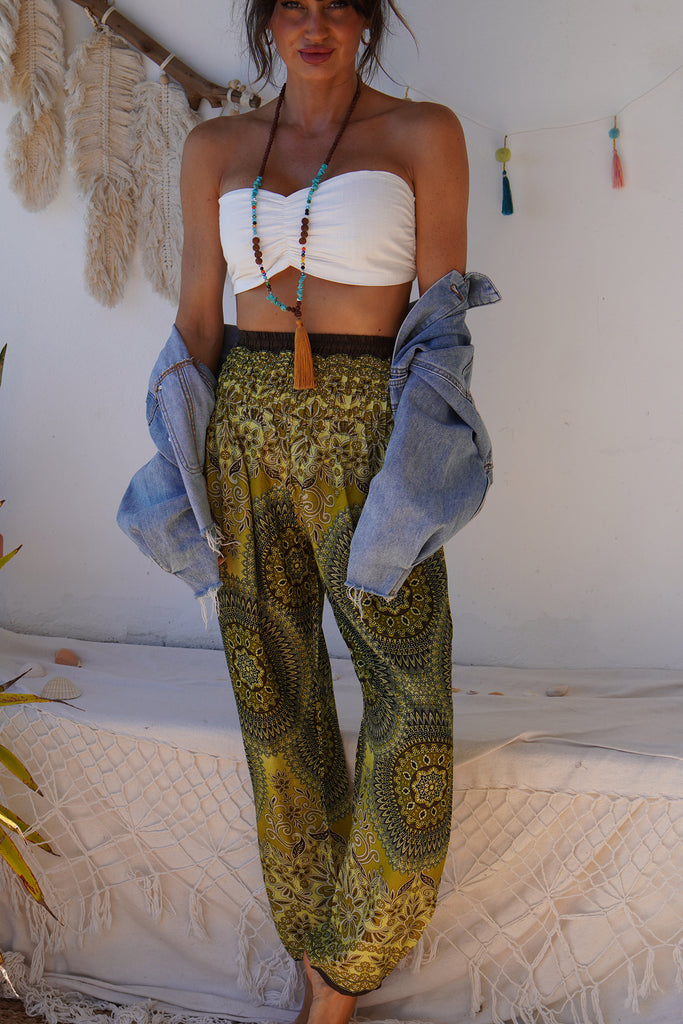 Perfect for those who love a boho style. With their elasticated ankle design, these trousers are both comfortable and unique, perfect for a relaxed and laid-back look. Great for festivals, yoga and chill days.