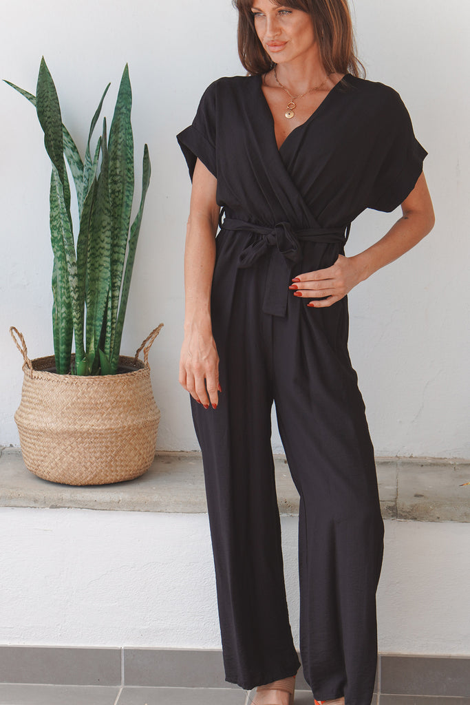 An easy one-and-done from our Urban collection, this tailored black jumpsuit has endless ways to wear and a cute tie waist.