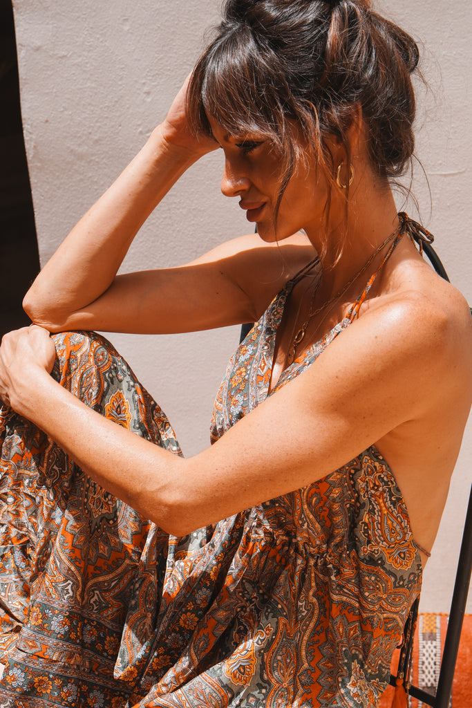 This beautiful jumpsuit is featured in a pretty pattern with a halter neck silhouette with a tie detail at the back which is adjustable to fit to the style you want and a comfy harem style finish.