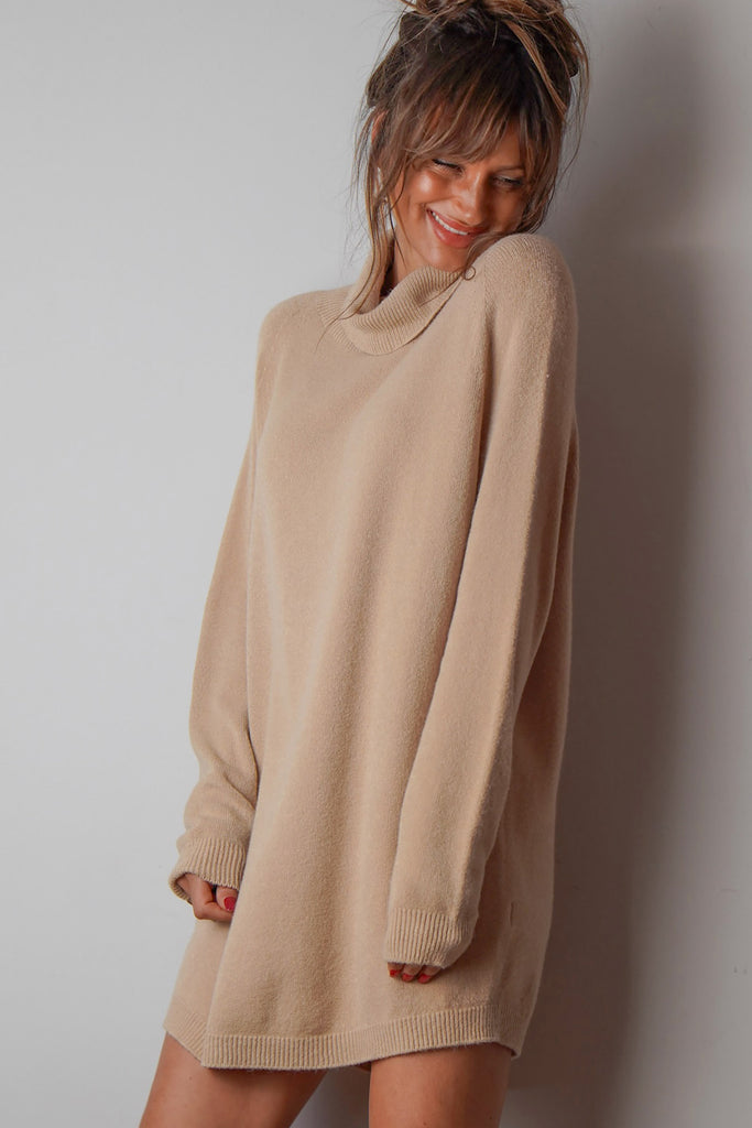 Ultimate easy everyday vibes! Stay cosy and cute in this mocha polo neck jumper dress. Its so soft and will keep you warm and snug and its easy to style with tights and boots. This jumper is a must-have for your wardrobe this season in a classic mocha colour.