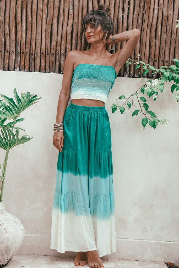 Features: Ombre print trousers with an elasticated waist and hip pockets and elasticated bandeau style top