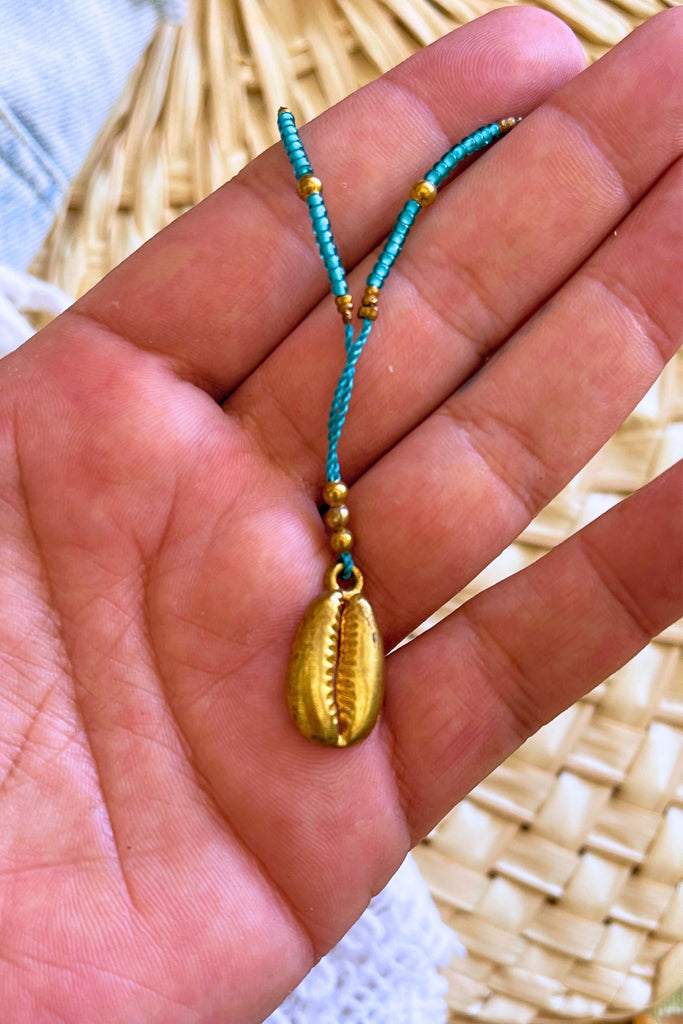 This necklace features stranded beads with a cowrie shell pendant on an adjustable cord. Perfect for layering for Summer.