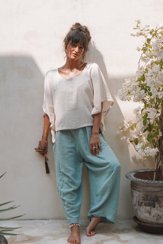 Effortlessly easy, our Organic Balloon trousers with their flattering shaped leg is designed to fit all shapes and sizes. Featured in a comfy-chic silhouette. So cool and comfy, they are the epitome of luxury. Designed in a balloon style with an elasticated easy pull on waist, and exaggerated leg detailing for that Oh-So-Comfy, yet Oh-So-Cool look.