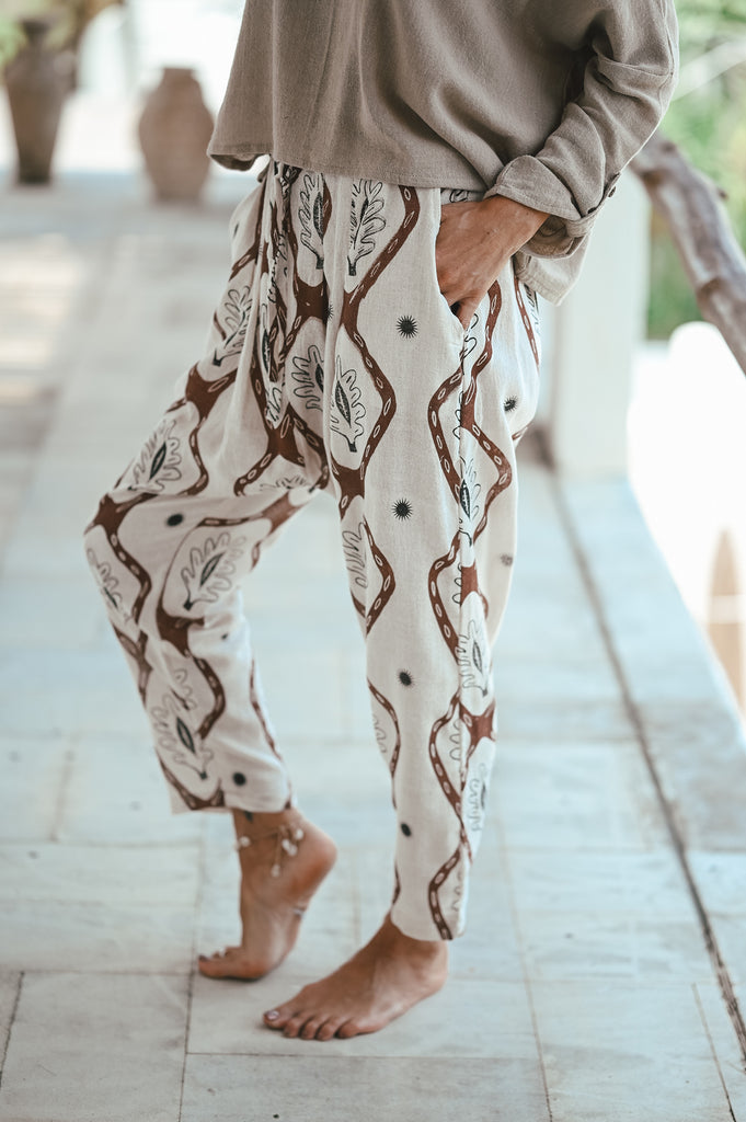 Hand Batik designed 100% organic trousers designed with a harem drop centre. Weaved from start to finish by hand. Made from organic plant materials. Featuring an elastic waistband, hip pockets, and a harem style silhouette, these ultra stylish pants will hip up your wardrobe.