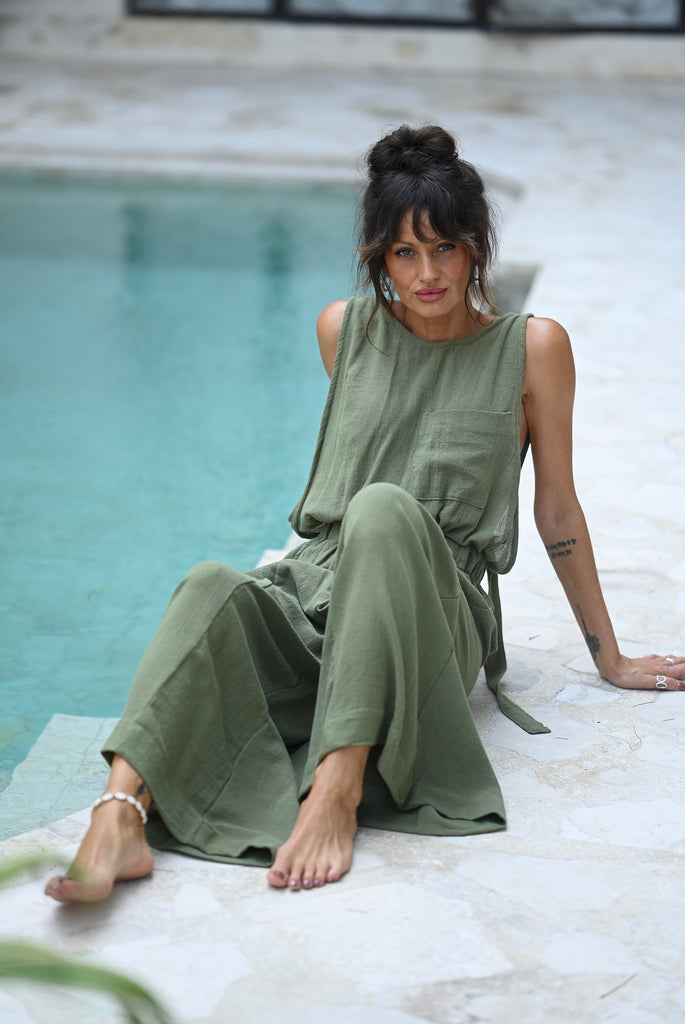 'Barefoot Bliss' Organic Flared Dungarees In Khaki Green
