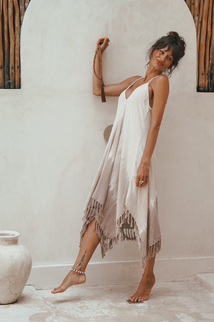 Experience the stunning elegance of our 'Coffee Time' tassel dress. Hand-woven and crafted from all-natural materials, this dress exudes simplicity and understated beauty. Perfect for a calm and natural look.