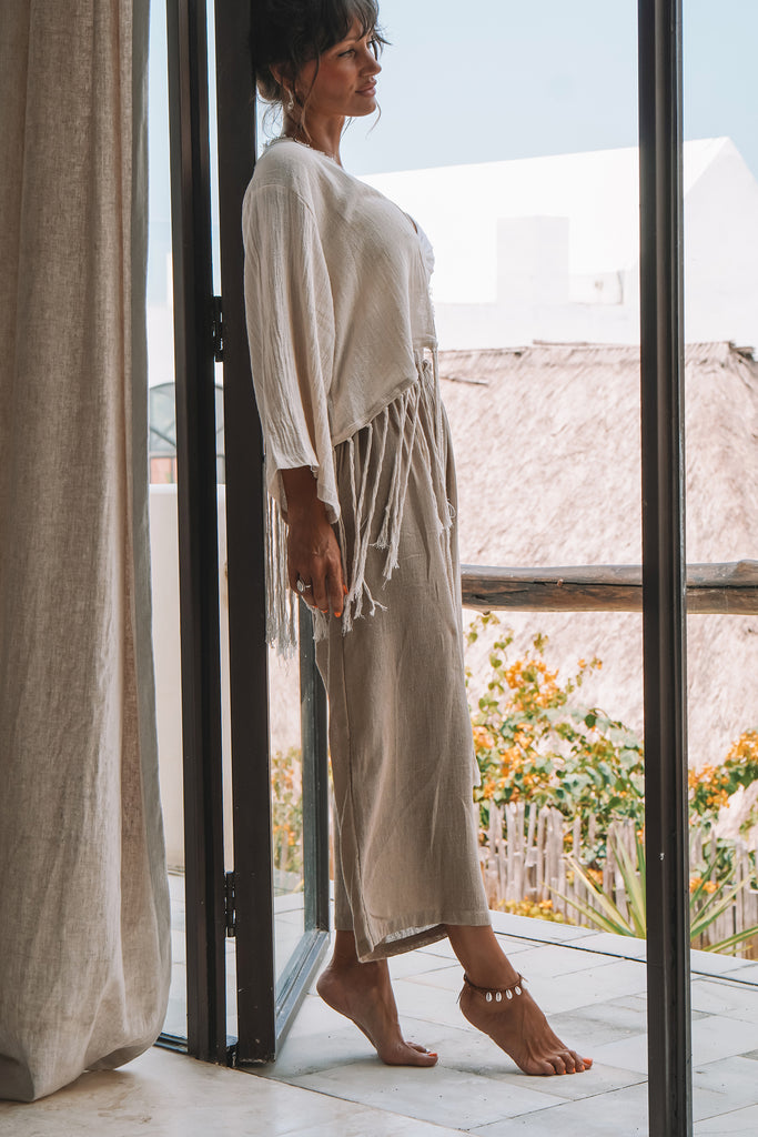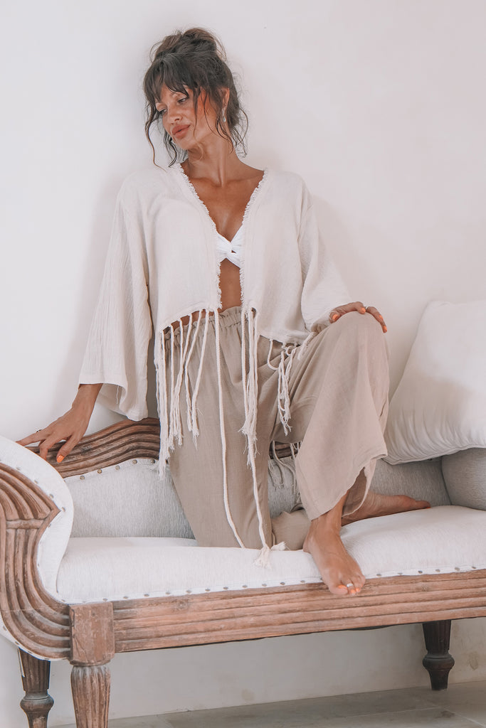Introducing our Handmade 100% Organic Fringe Jacket In Natural, crafted from the finest organic material. Inspired by bohemian fashion, this jacket features gorgeous tasseling and a front tie for a chic, laid-back look. Wear it open or closed to exude effortless style. The large sleeves add a unique touch to this stunning piece. Elevate your wardrobe with this natural and one-of-a-kind jacket