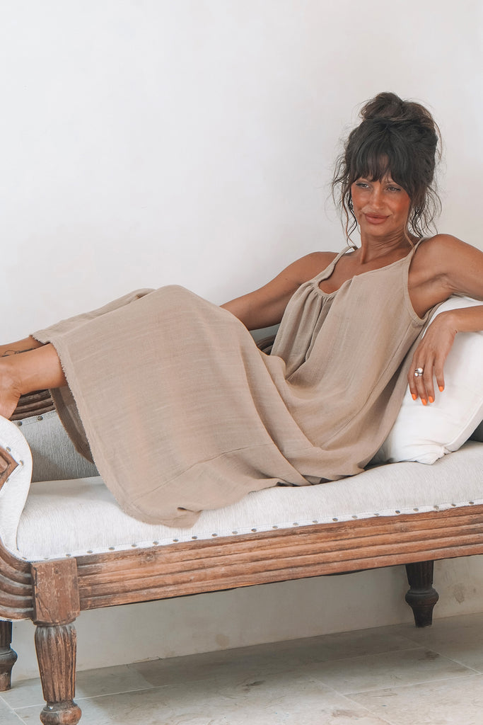 Indulge in the luxury of our Natural 100% Organic Dress in Mocha. Made from plant-derived material and featuring simple straps and a tie back for added detail. Embrace simplicity in this large, throw-on dress and float through the summer season with a chilled out vibes.