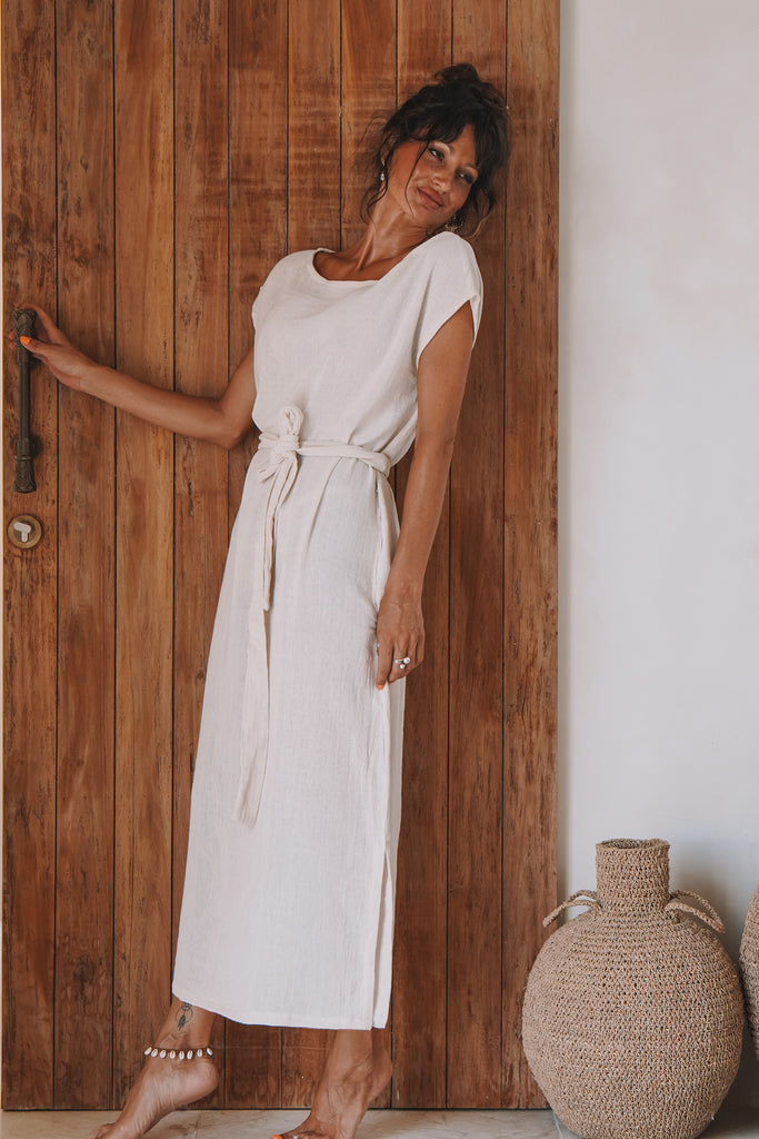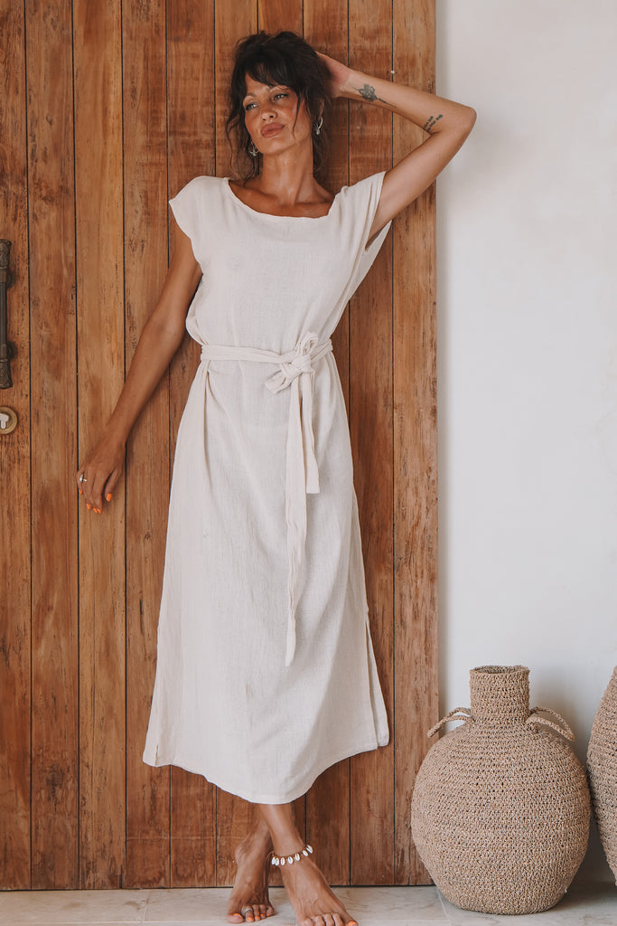 Indulge in the understated elegance of our Natural Organic Dress. Crafted from 100% organic materials, its simplicity is key with a small side slit and wrap around belt. Experience a calm, natural style with this stunning dress.