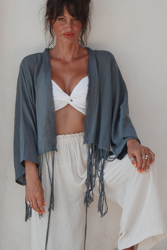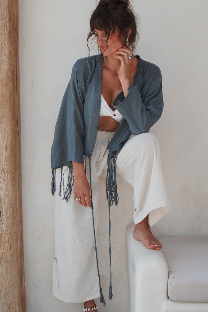 Crafted from the finest organic material. With boho vibes, this jacket features gorgeous tassel detail and a front tie for a chic, laid-back look. Wear it open or closed. The wide sleeves add a unique touch. Perfect for layering over a simple bandeau for a cool look.