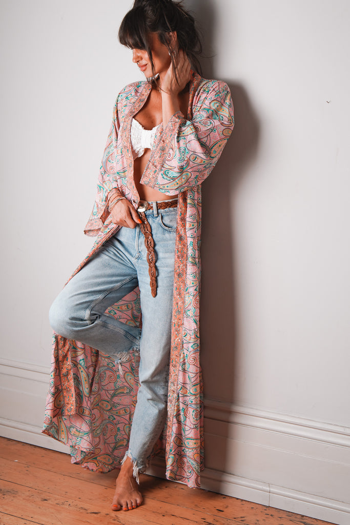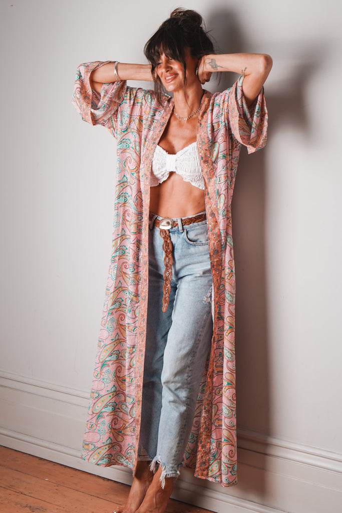 Introducing the 'Nova' silk maxi kimono, a beautiful and versatile addition to your wardrobe. Made of luxurious silk mix material with a tie around strap, this maxi length kimono features stunning boho prints.