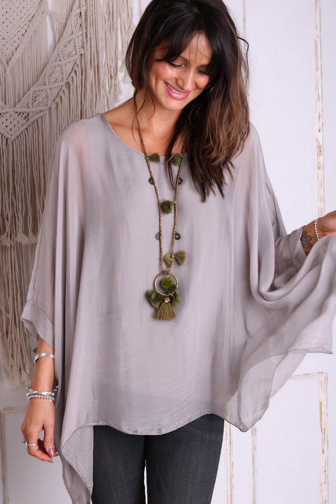 Our 100% Plain Silk tops are designed and made in Italy. Featuring a longline hem at each side, complete with an attached under garment for extra comfort. These particular styled tops are a best seller in our store. A totally flattering design, effortlessly worn for complete elegance.