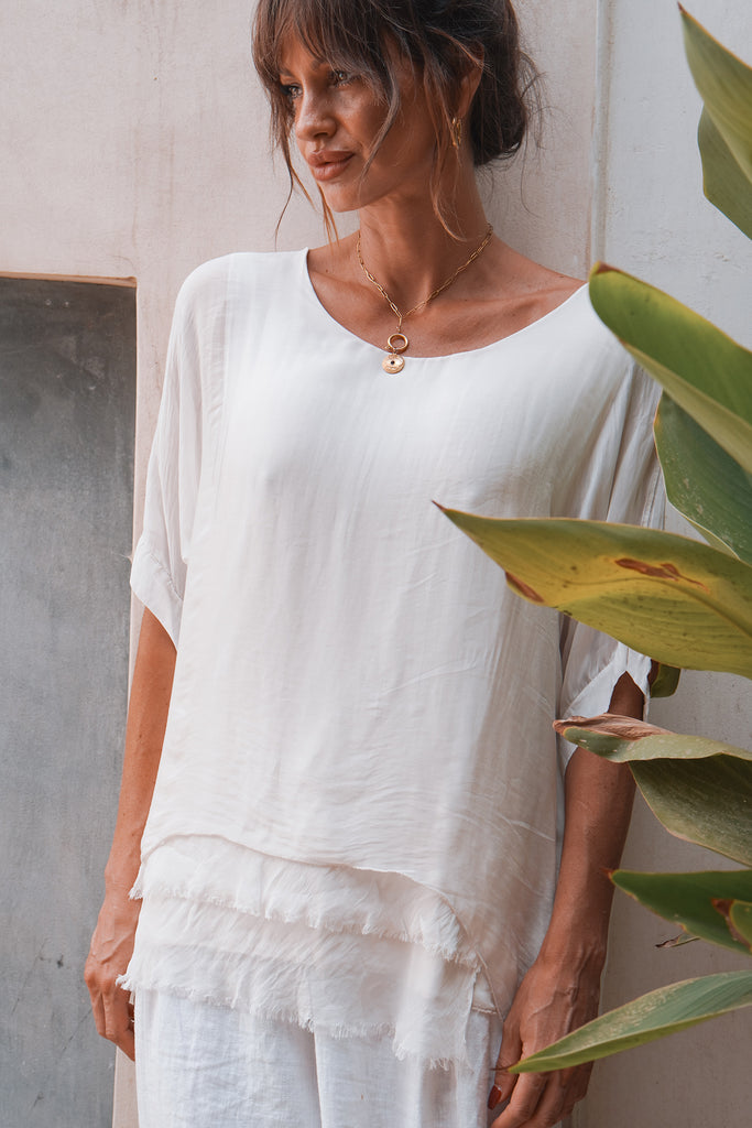 Our 100% silk tops are designed and made in Italy. Featuring a raw frayed ruffle trim and a longline edge hem. Complete with an attached under garment for extra comfort. Easy wearing for everyone in a flattering and beautiful style