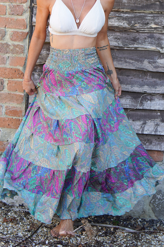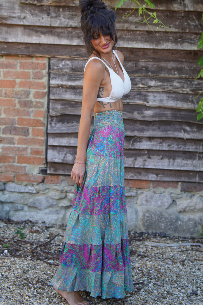 With its flowing silhouette and boho patterns, this skirt brings together comfort and artisan beauty. An elasticated waistband offers a flattering fit, while the full-length design makes it perfect for everything from barefoot beach walks to sunset dinners under the stars.