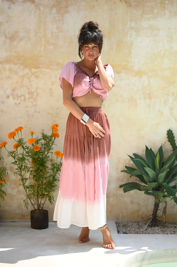 Infused with a bohemian flair, this top and skirt set is effortlessly charming. The top features a cute tie detail and has duo ways to wear - it can also be worn off the shoulders. The elasticated waist of the skirt and flowed tiered design ensure comfort and style. Incorporate these fabulous pieces into your wardrobe for versatile and trendy looks.