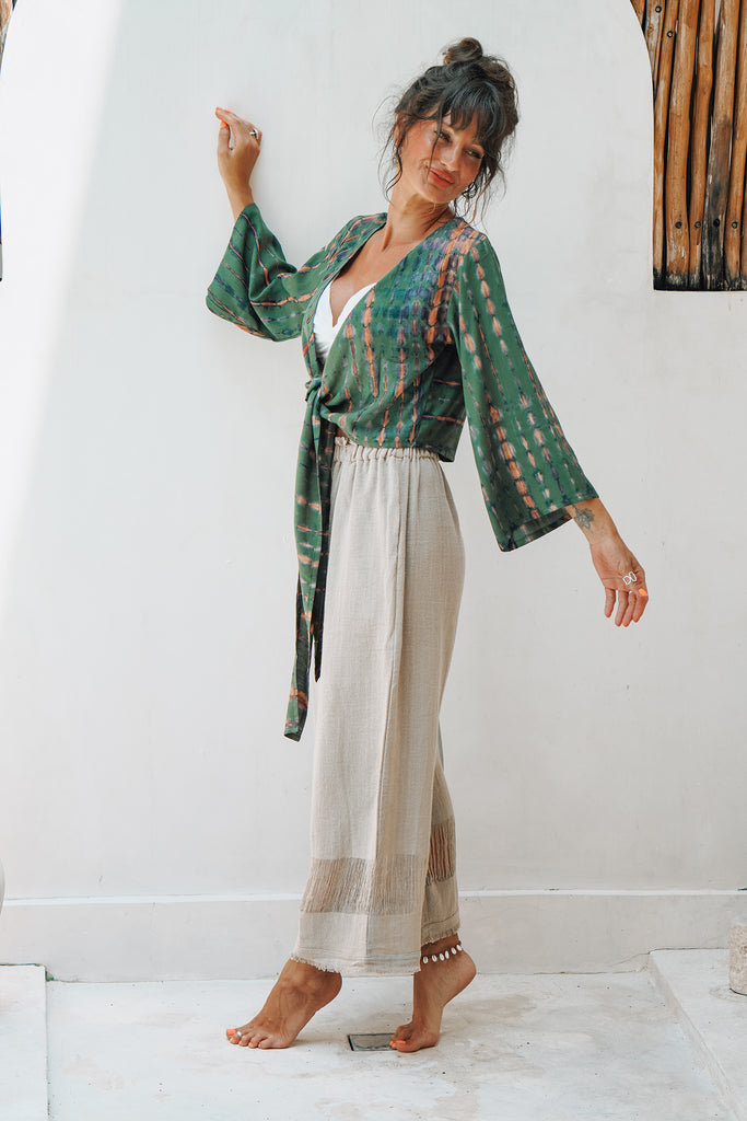 Individually crafted in a boho style, this top features a tie-dye print and charming short sleeves. It's a bold choice that can be worn in two different ways - as shown or tied snugly in the front for a one-of-a-kind appearance.