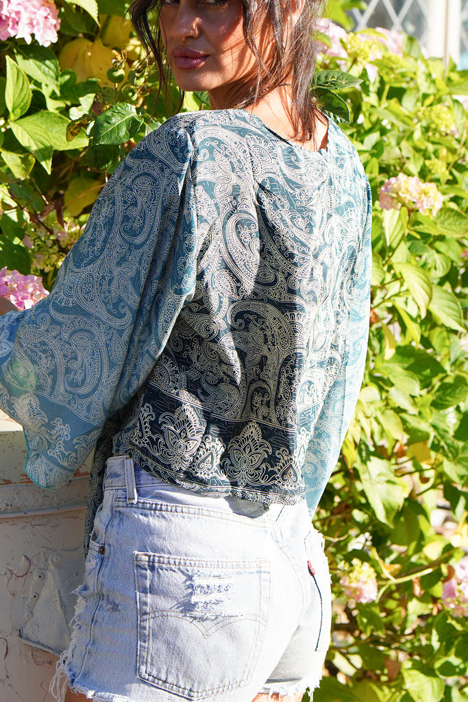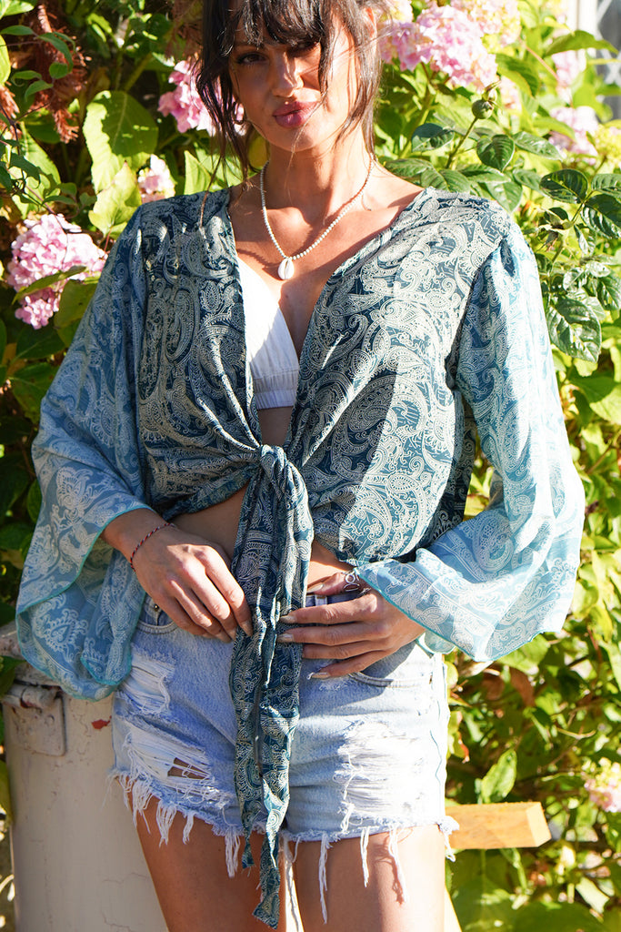 'Echoes' Silk Tie Up Top With Wide Sleeves