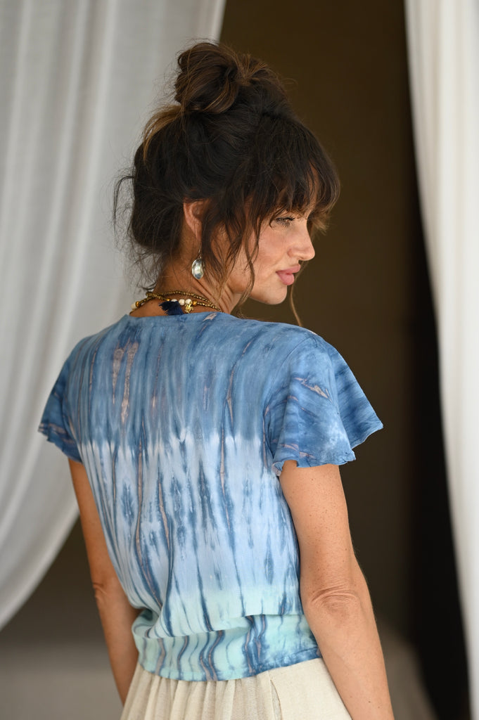 Individually crafted in a boho style, this top features a tie-dye print and charming short sleeves. It's a bold choice that can be worn in two different ways - as shown or tied snugly in the front for a one-of-a-kind appearance. With its timeless design and playful vibes, it's guaranteed to become a wardrobe essential. It's also a great way to cover your arms when wearing your favourite outfit!