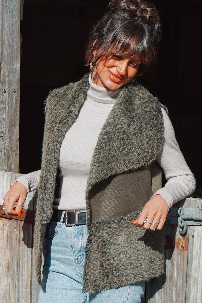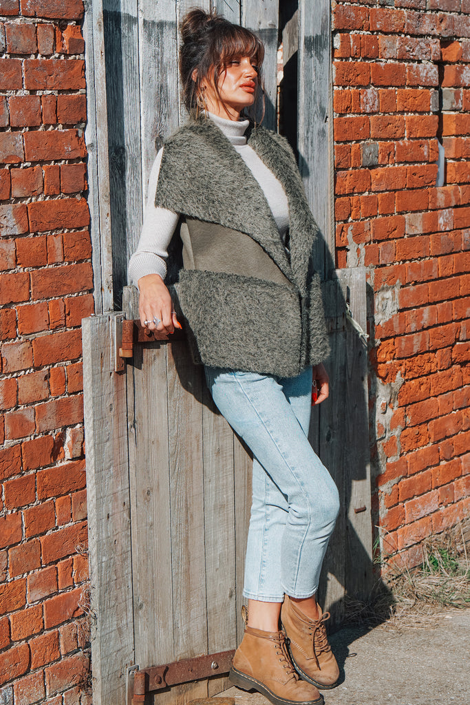 Cold-weather details take centre stage in this super cosy gilet with faux fur details in a beautiful green colour that will go with nearly anything. Open-front style with falls beautifully. and perfect for transition-season layering for years to come.