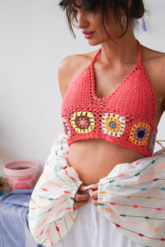 Inject some bohemian vibes into your wardrobe with this adorable Crochet Bralet Top. This summertime must-have is perfect for easy style. Daisy crochet knitted in throughout and a simple tie up neck, and cute crochet tied back, easy fits for everyone.