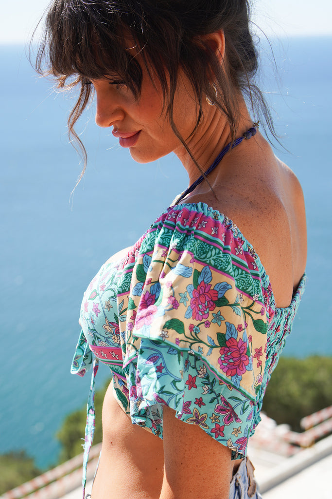 Such a cute top with a gorgeous floral pattern and with short sleevesThe bralet front gives extra boho vibes. Whether worn alone on warmer days or nights out or layered under your favourite pieces, this top will be your go-to for your boho look.