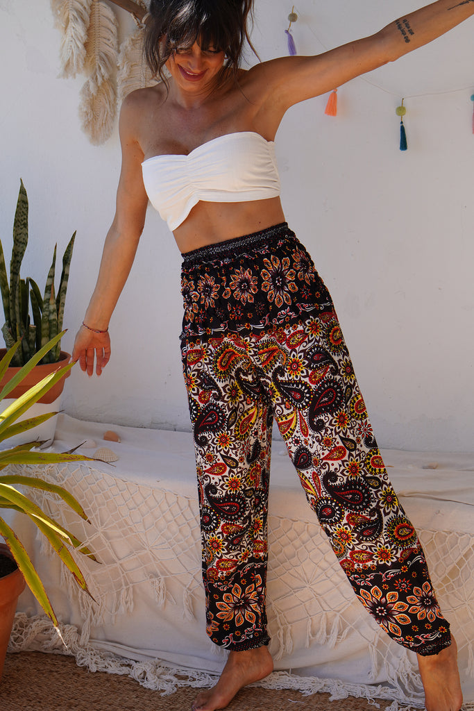 Perfect for those who love a boho style. With their elasticated ankle design, these trousers are both comfortable and unique, perfect for a relaxed and laid-back look. Great for festivals, yoga and chill days.
