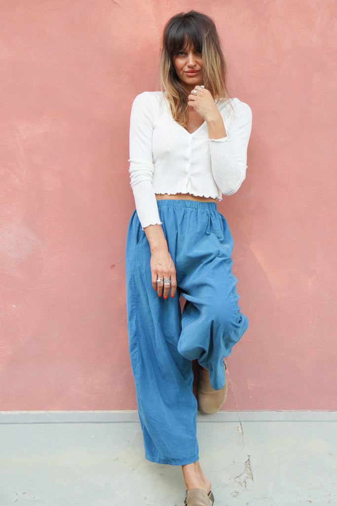 Cool in corduroy these Italian made pull on pants will be your go-to from this season to the next. Designed in a pull on, mid rise, tapered barrel silhouette, they are the definition of effortless.
