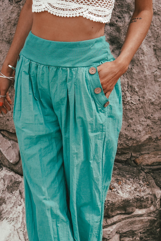Unwind in these chilled, button pocket trousers. Featuring stretchy ankle bands and a waistband. These boho-inspired pants are perfect for a laid-back look.