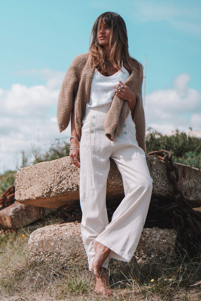 Our 'Peaceful Days' trousers are perfect for warm summer days. Featuring an elasticated waistband, buttoned front and wide leg, these trousers can be worn on the hips or high waisted for a comfortable, tailored fit and made from a soft cotton blend