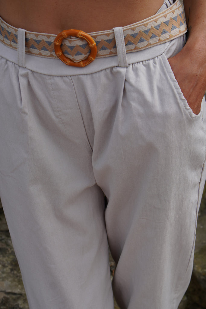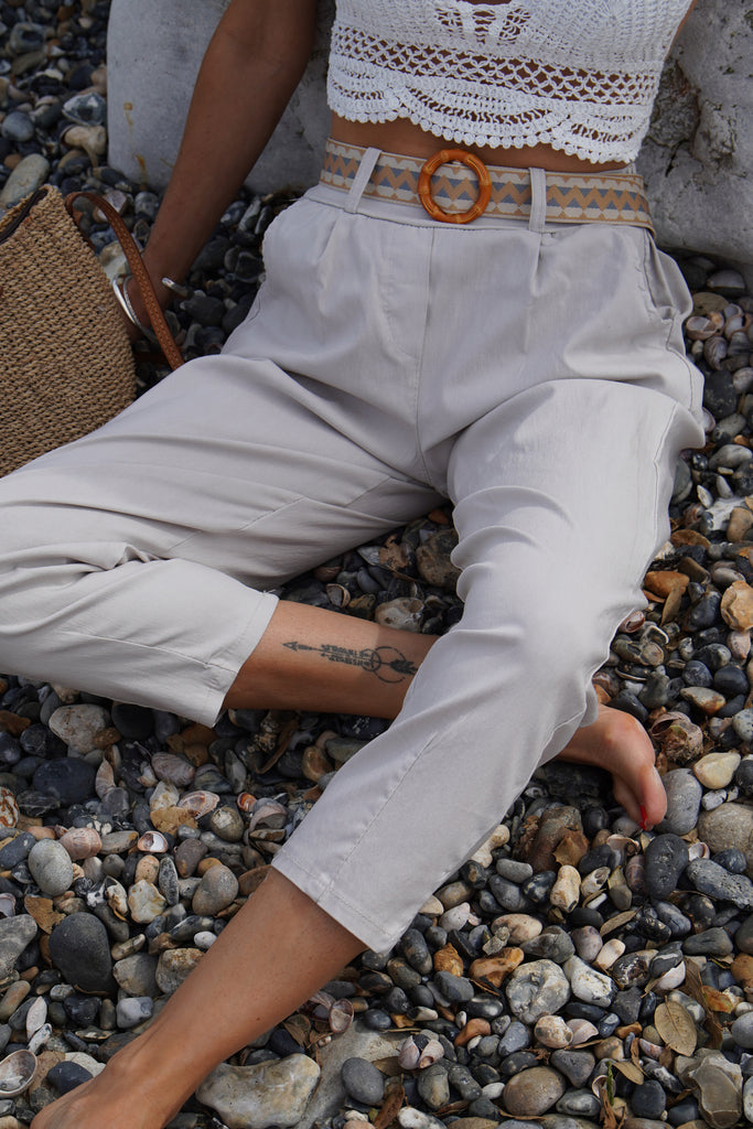 Crafted in Italy with an elasticated waistband and button front, these trousers feature a unique combination of relaxation and stretch fit material, providing a perfect fit for any body type. The fun belt and side pockets add a touch of charm, while the ability to roll up and cropped or wear full length provides versatility for various weather conditions