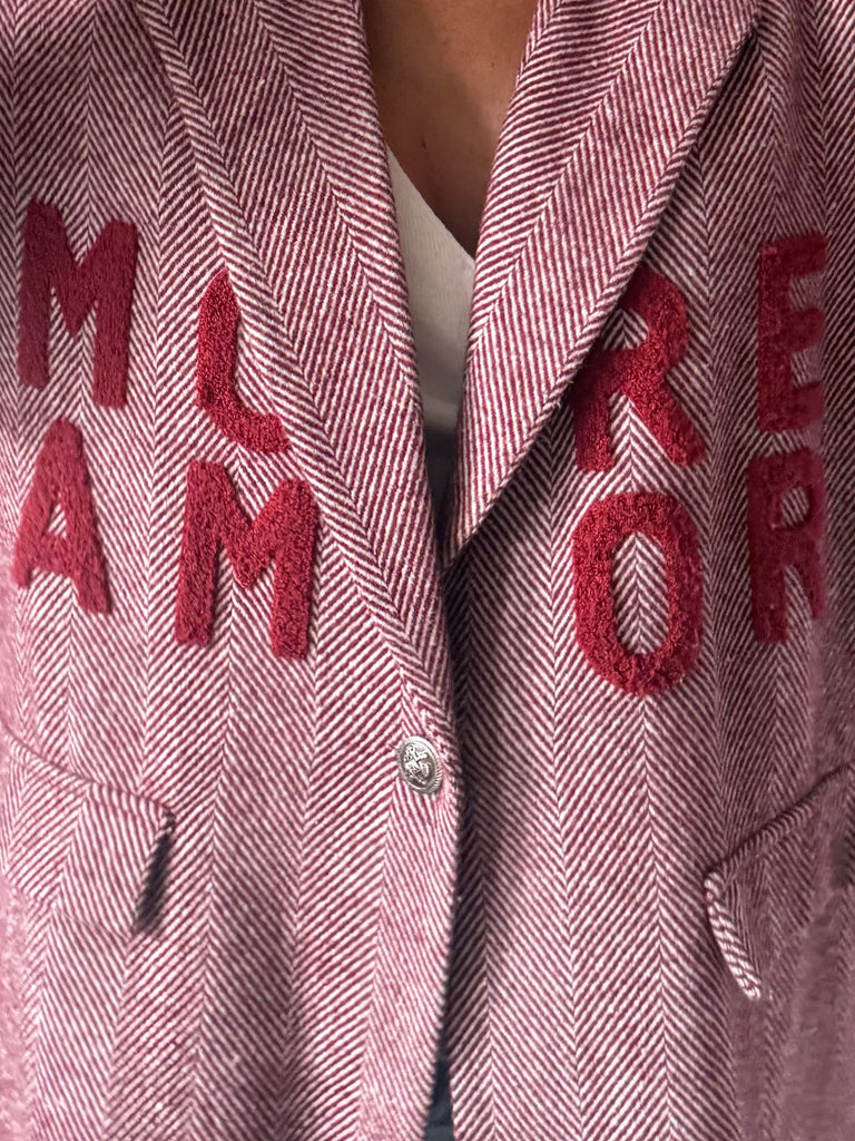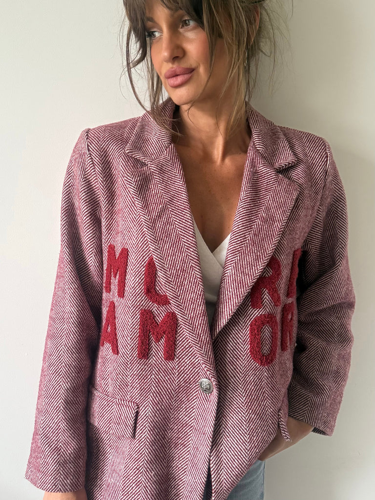 Boho vibes with every look with this cute Amore printed jacket, featured in a soft fabric with button front and pink and red stripes. Perfect for this season.