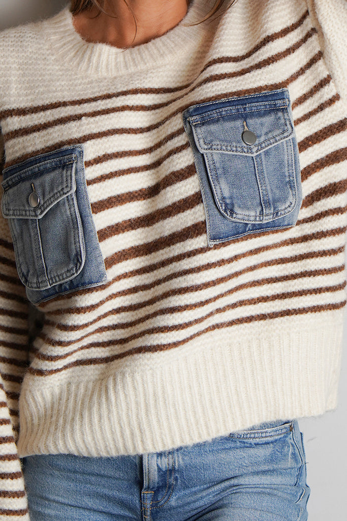 Oh so unique in this stripe jumper with denim pocket detail. Beat the chill this season, our chunky knits are perfect for cosy days ahead.