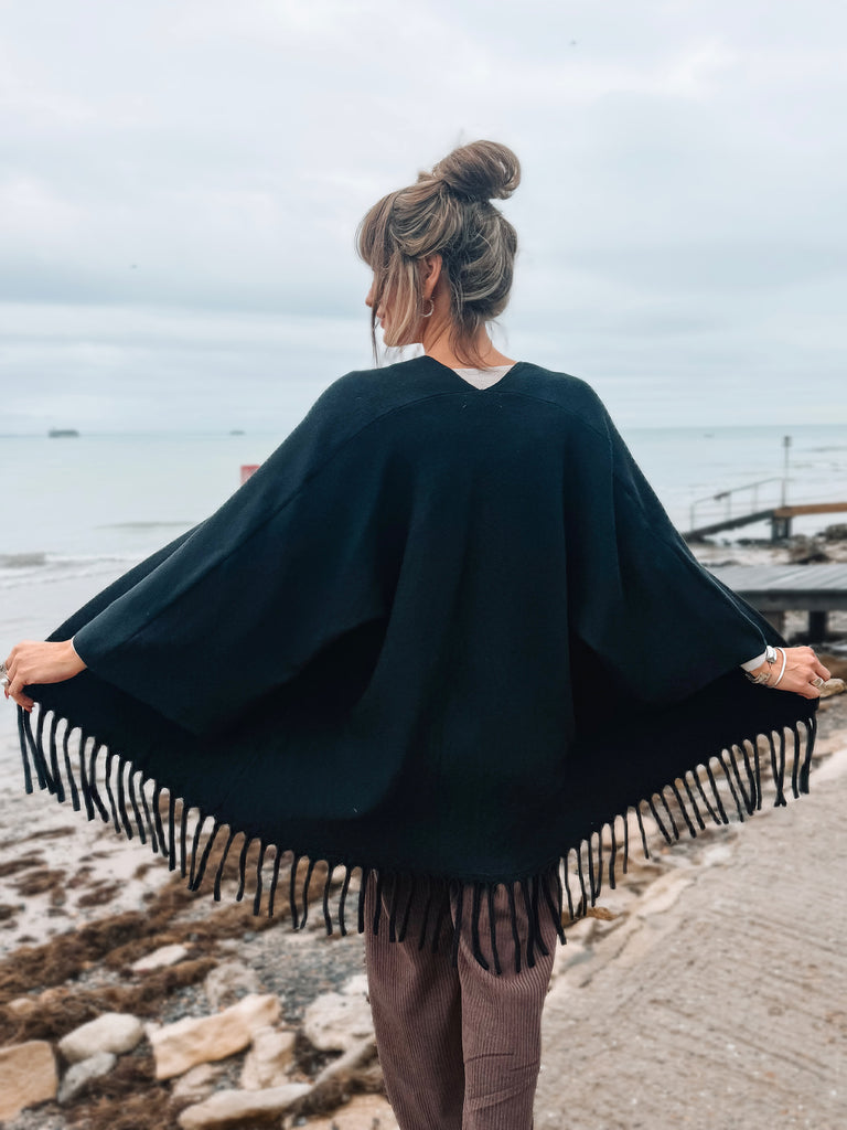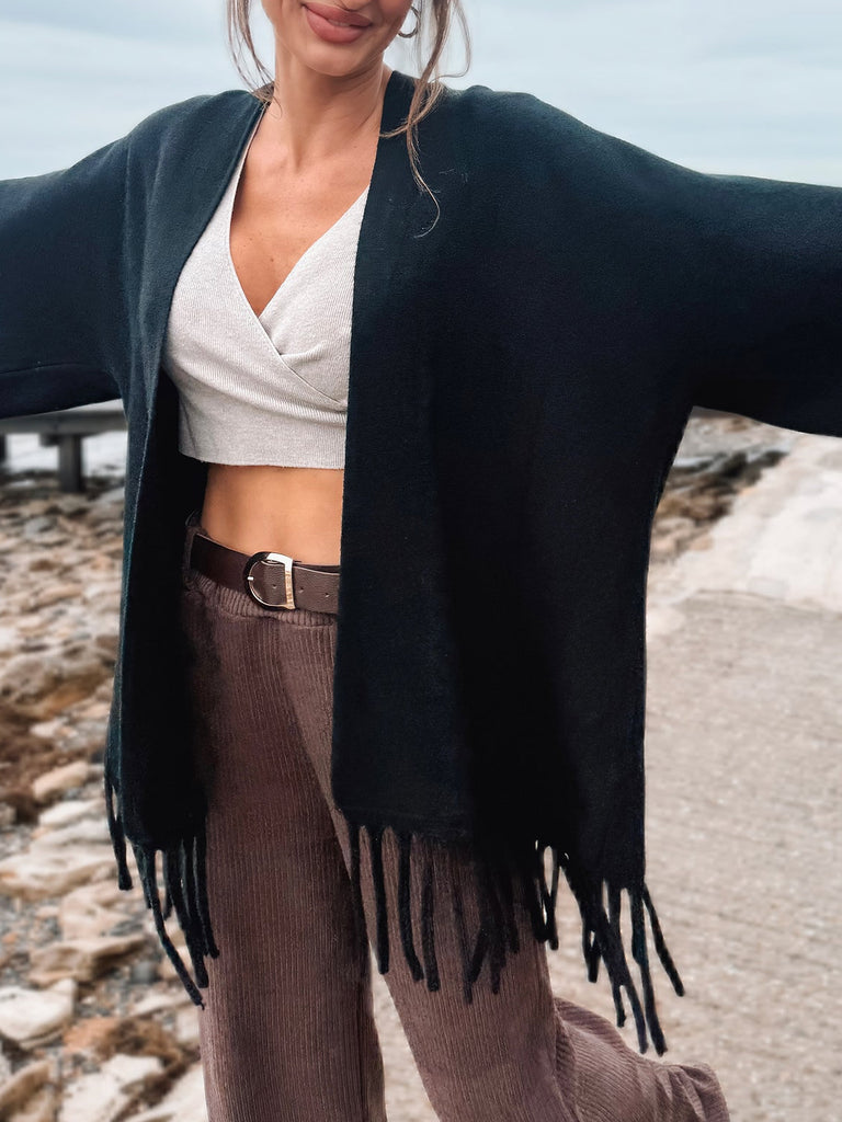 Boho vibes with every look with this cosy layer, featured in a thick fabricated soft fabric with tassel boho finishing. Layer over jumpers and more for an extra warm look and feel.