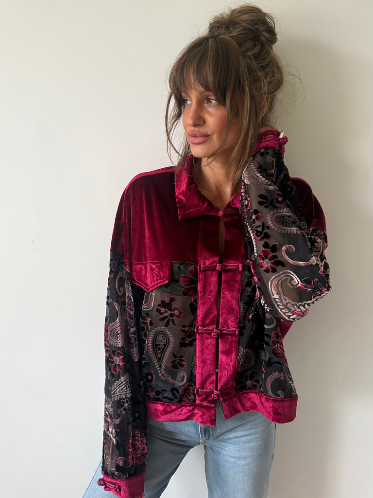 Ethereal vibes are within reach; this enchanting jacket features dazzling embellishments, luxe velvety fabrication, and a subtle cropped silhouette. Ultimate boho cosy vibes this season.
