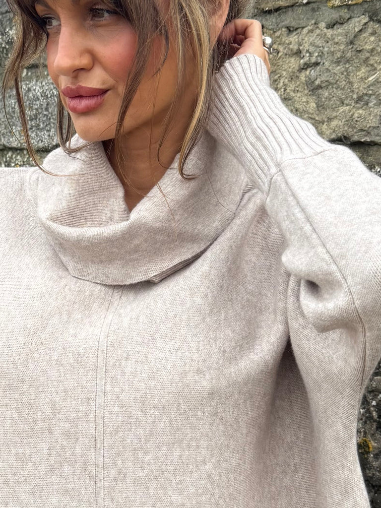 Made in Italy. Your ultimate cosy essential! This adorable jumper features super soft fabrication, thick fabricated and cosy, roll neck, long sleeves and frayed edging. Pairs beautifully with almost anything!