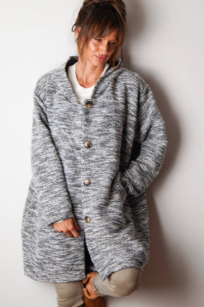 Upgrade your outerwear with our ‘Coastal Vibes’ coat with its cool grey patterning and a buttoned front. Stay warm and cosy with its hooded design. It's perfect for any outfit, easy to style and a must-have addition to your wardrobe.