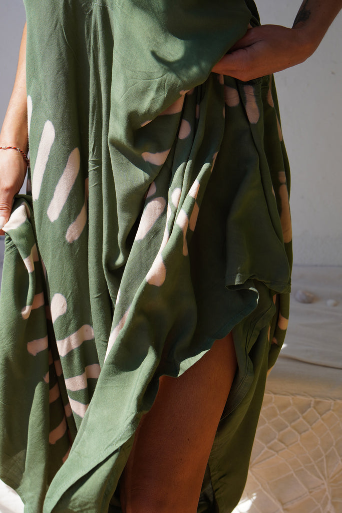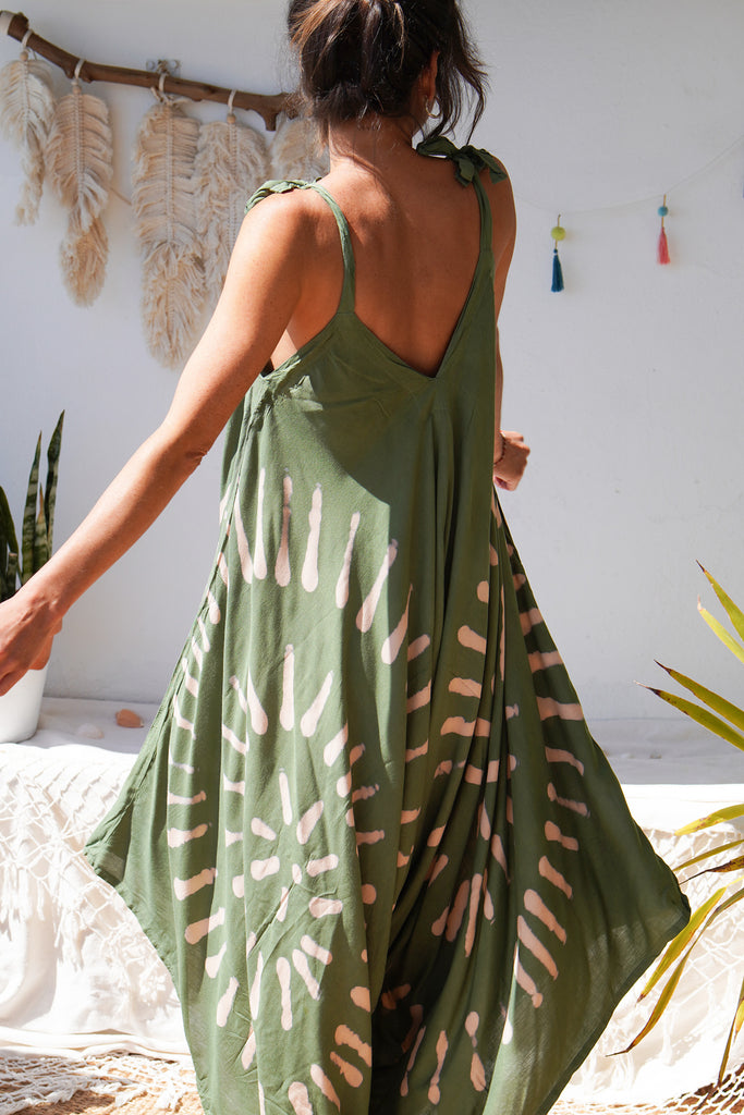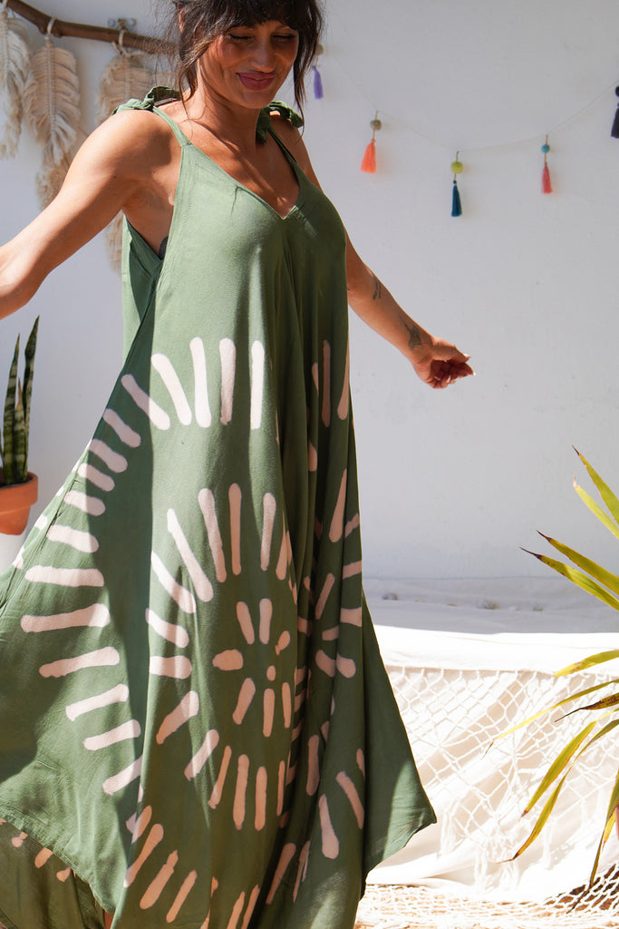 With a beautiful batik style sun burst pattern and a gorgeous green hue. It has adjustable straps and wide legs. So soft and comfortable and great for festivals, the beach or chilled days.