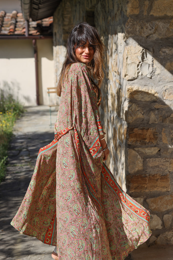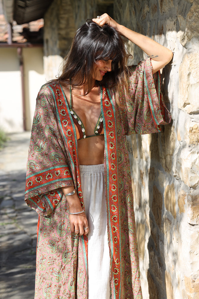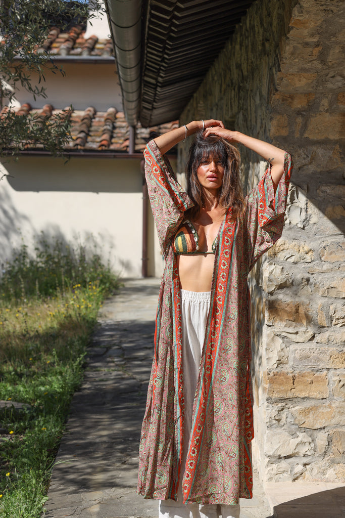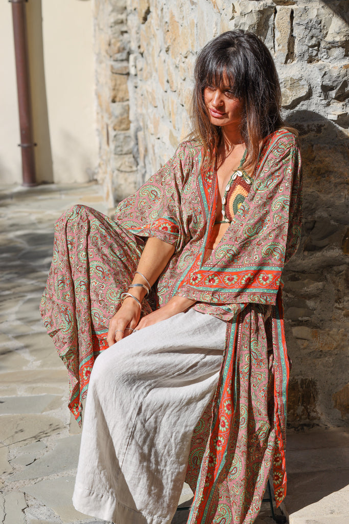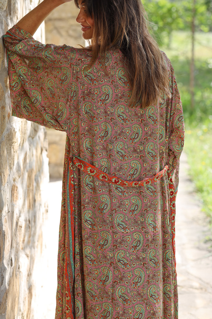 This Feeling This Paisley Silk Kimono Jacket is the perfect addition to any wardrobe. With a longline paisley print, it brings boho vibes to any look. Lightweight and made from a silk mix, tie it for the desired look and show off your style. Float around in class in confidence and comfort.
