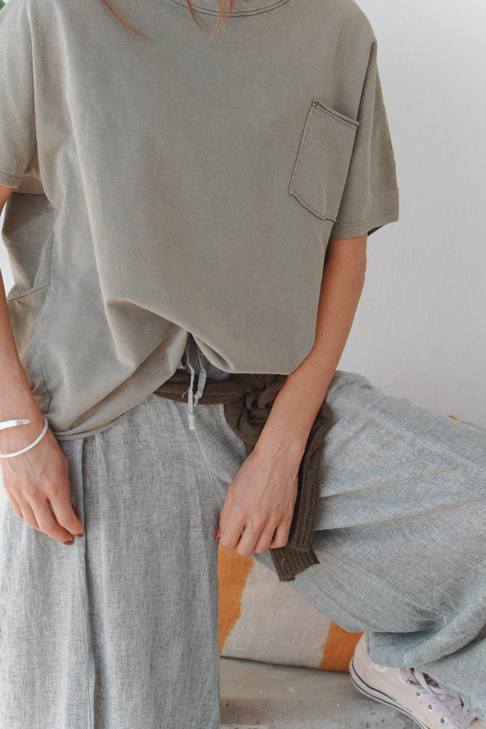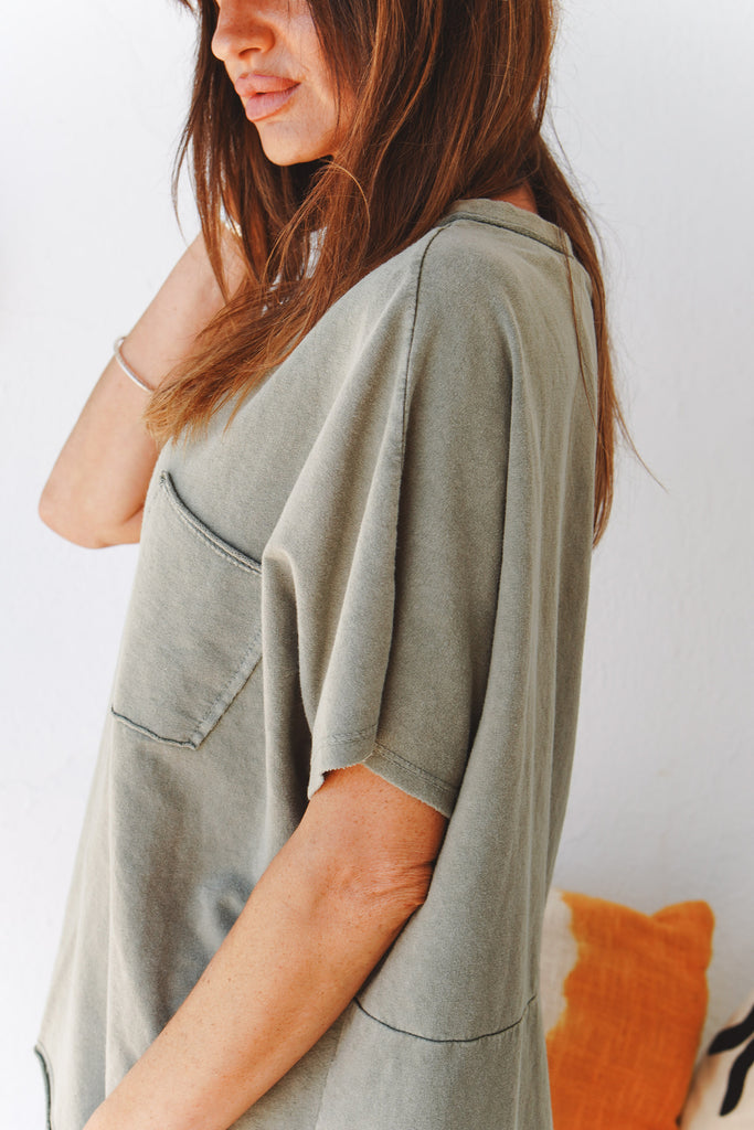 With its relaxed fit thick Italian jersey cotton and embroidered detail on the back, this khaki top is perfect for everyday comfort and style.