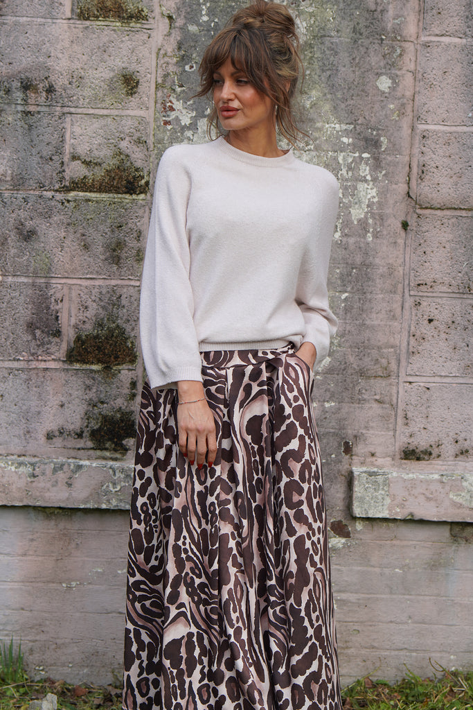 Show off your boho spirit with this animal print think fabrication satin look maxi skirt, with pockets. Its flowy, lightweight fabric and relaxed fit make it perfect for easy, everyday wear. The bold animal print adds a fun, wild touch — pair it with a simple top for an effortlessly chic boho look.