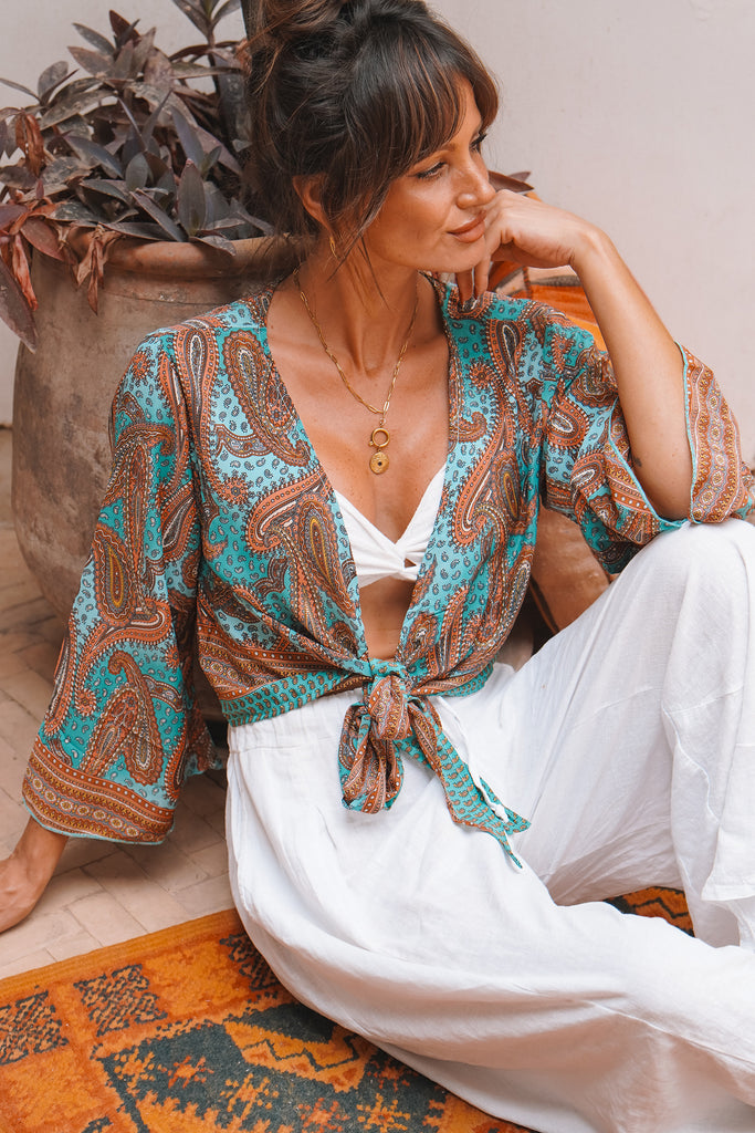 A cute tie around kimono. This lightweight kimono is featured in a colourful pattern with a border print. Layer over a bandeau or use as a light jacket, it's the perfect casual outfit and so easy to style.